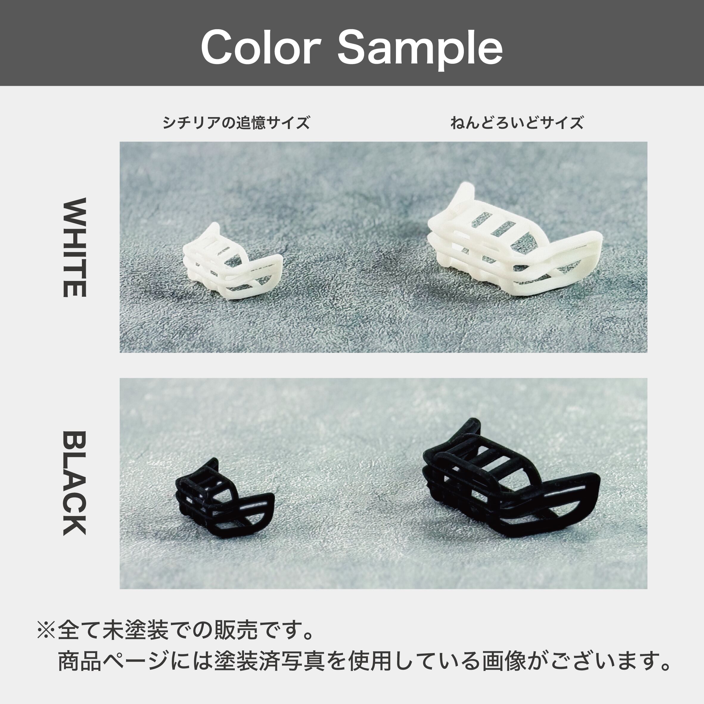 試作品、出力不良、割ってしまったものなどの廃材を塗装確認用にお付けできます。ご入用の方はオプション「廃材:あり」をご選択ください。
