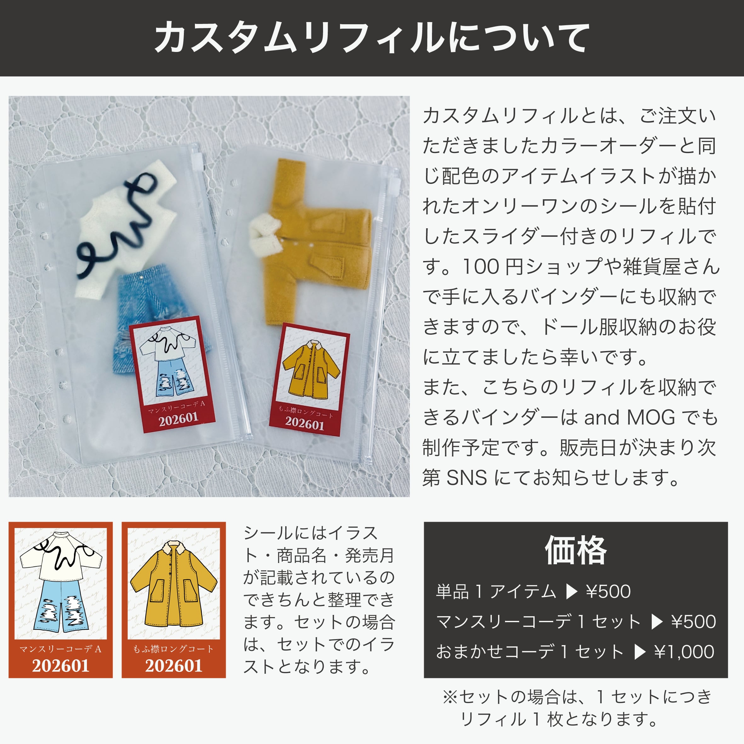 カスタムリフィルとは、ご注文いただきましたカラーオーダーと同じ配色のアイテムイラストが描かれたオンリーワンのシールを貼付したスライダー付きのリフィルです。シールにはイラスト・商品名・発売月が記載されているのできちんと整理できます。セットの場合は、セットでのイラストとなります。