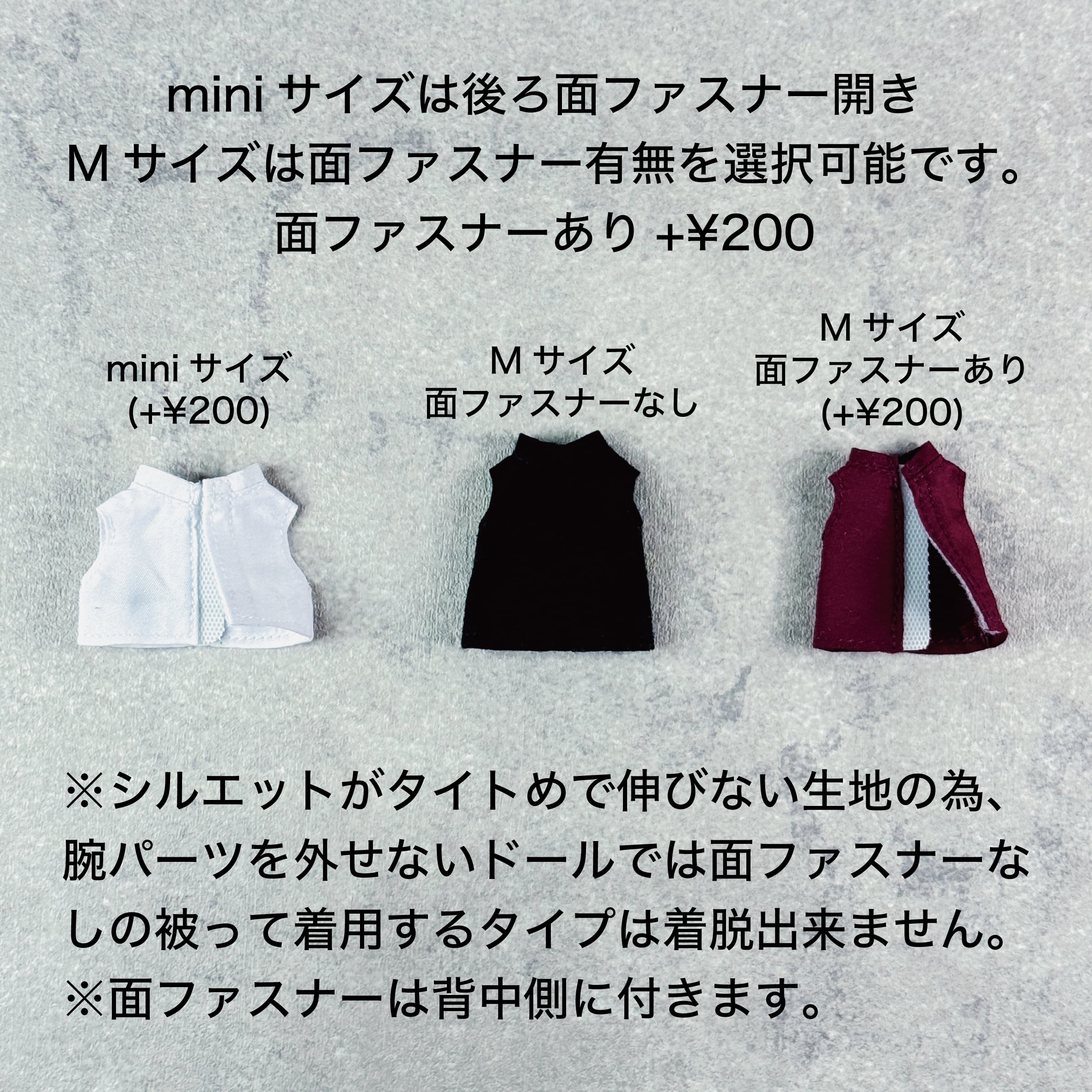 ※miniは面ファスナーありのため+¥200、M(面ファスナーあり)も+¥200です。